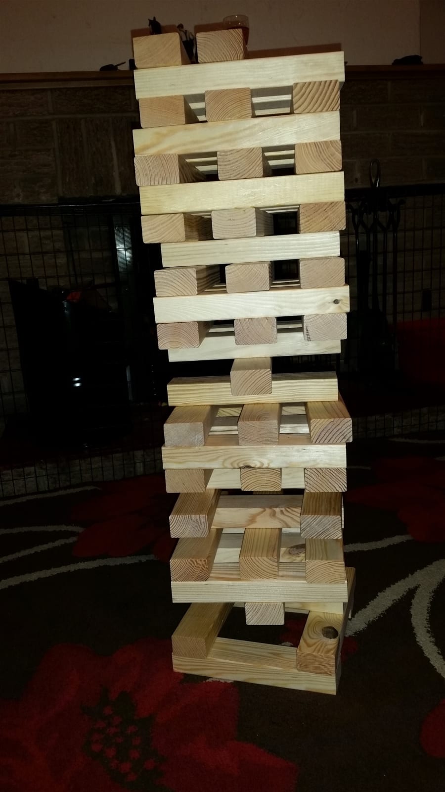 The aim of the game is to take it in turns to remove 1 block at a time and place it on the top of the tower without the tower falling over. The person who makes the tower fall over looses the game!