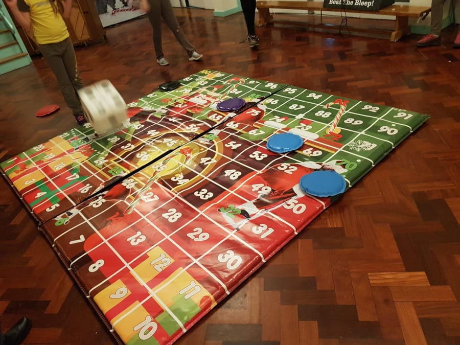 This giant Christmas Snakes & Ladders is for up to 4 players and includes an oversized padded game mat, 4 playing counters and a dice. This game is suitable for indoors or outdoors.