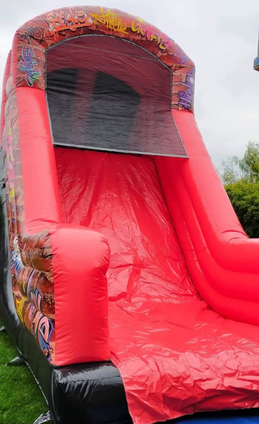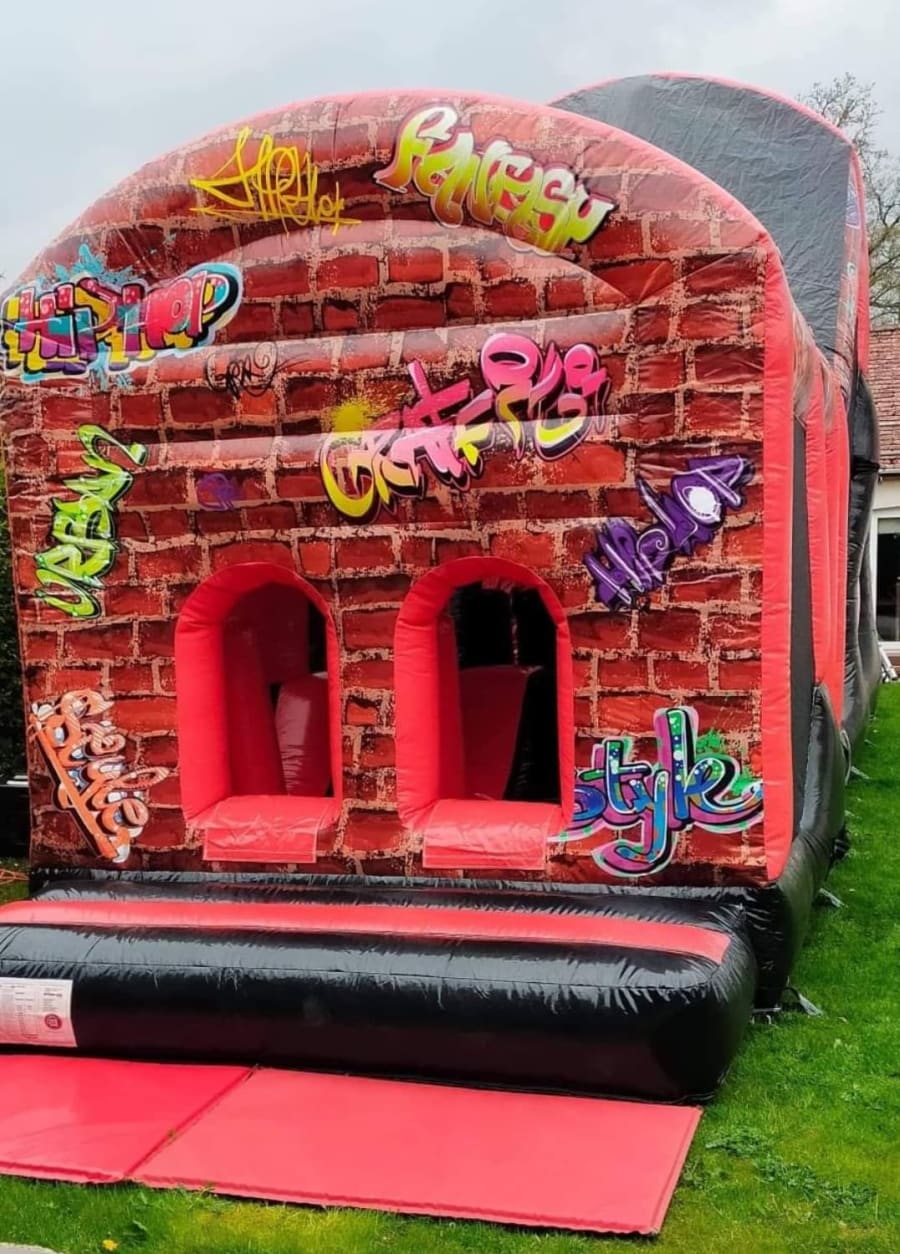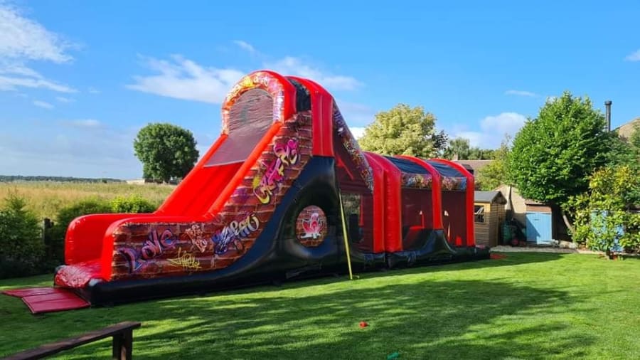 This is our AMAZING 2 part 40ft GRAFFITI themed assault course with a WHOPPING 10ft platform slide!