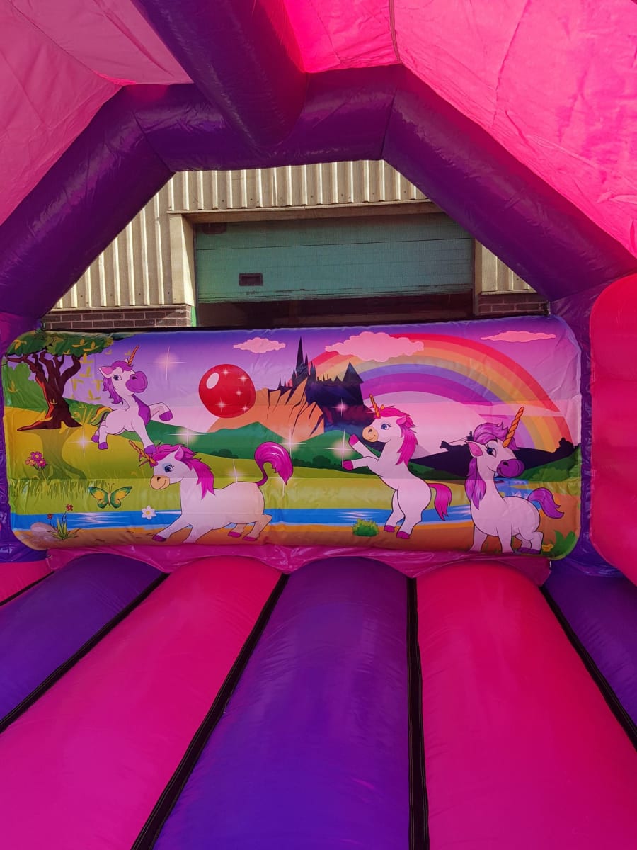 This is the newest of our Unicorn bouncy castles for hire and can be set up indoors or outdoors. Given it's size, it fits most gardens and also has a sewn in shower cover to protect you from those unpredictable wet days!
