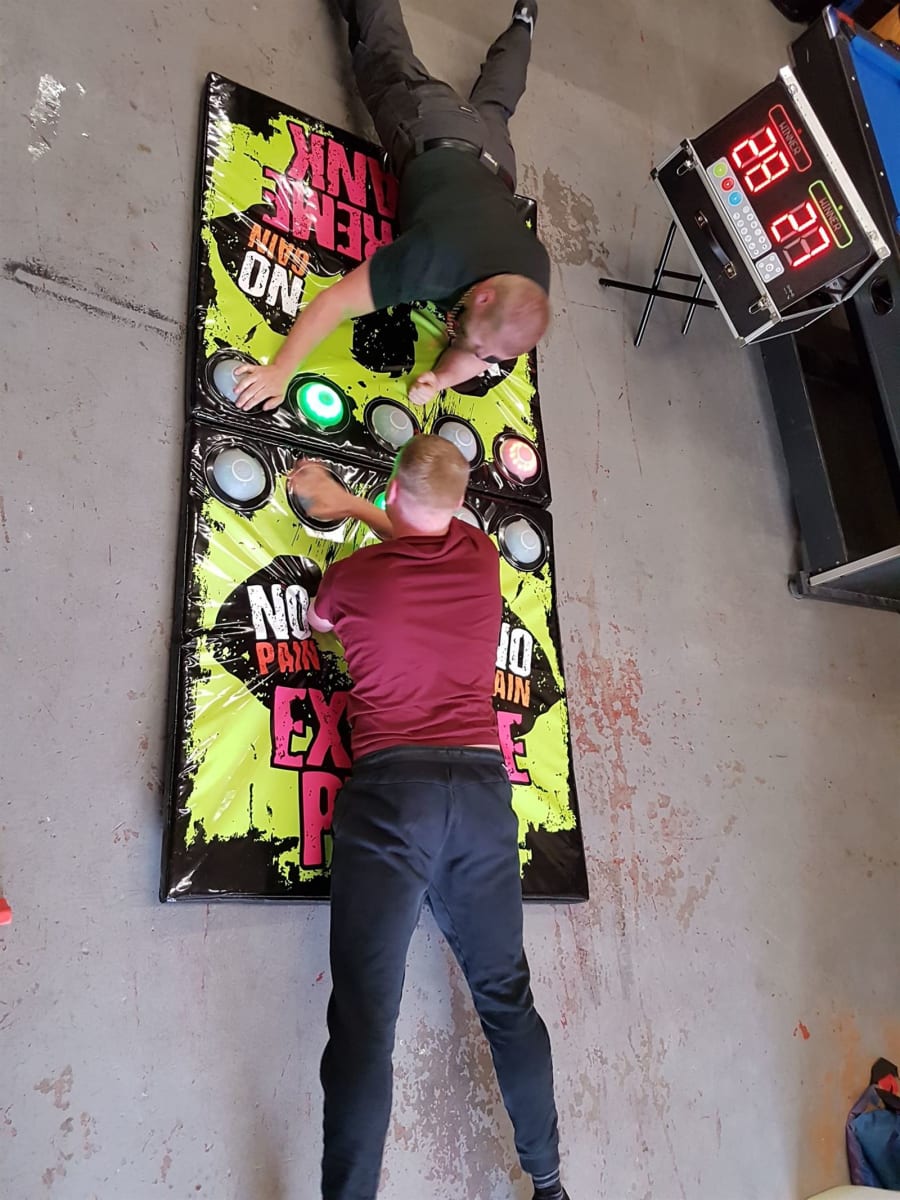 This is a two player game and players need to choose whether they will catching the RED or the GREEN light. The players lie on the mat in the 'planking' position facing each other. The 10 spots between each player light up either red or green and each player needs to hit as many of their chosen lights as possible before time is up, once your coloured spot has been hit another spot will light up, the faster the game is played the more spots will be lit up together...The winner is the player who hits their coloured spots the most throughout the game and has the highest score, this is counted up and displayed on a scoreboard. At the end of the game the 10 spots will all be illuminated in the winners colour!