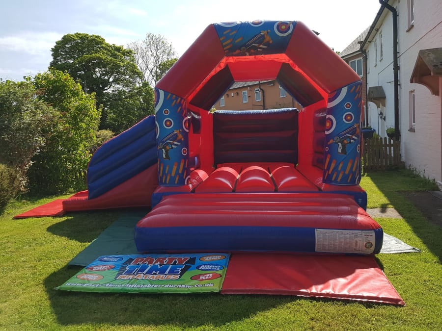 Our Nerf bouncy castle with slide is perfect entertainment for children up to 12 years old at birthday parties and fun days etc.