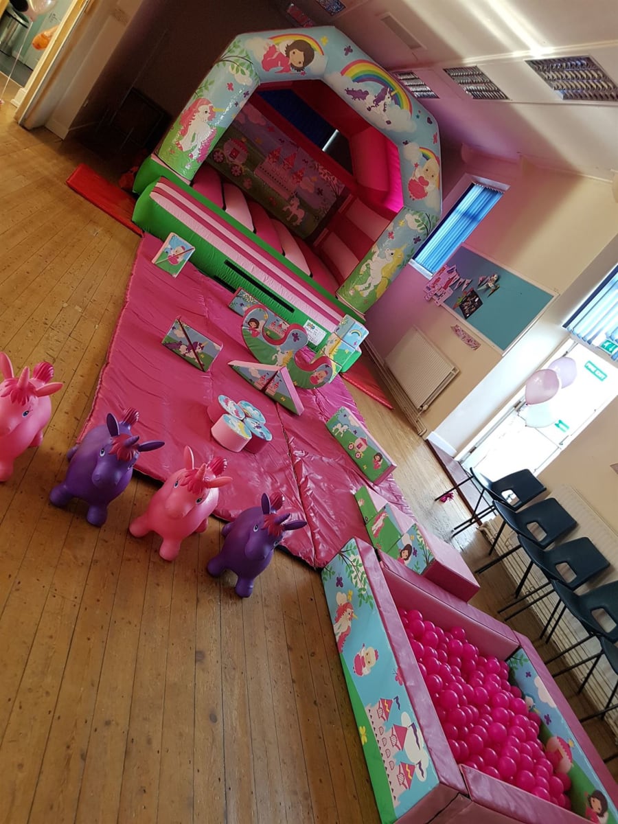 A customer recently hired the Deluxe Princess & Unicorn Party Package for her daughters birthday party. Any of ourChildrens Bouncy Castles up to 12ft high will fit in this hall along with any of our Soft Play, Add Ons and more!