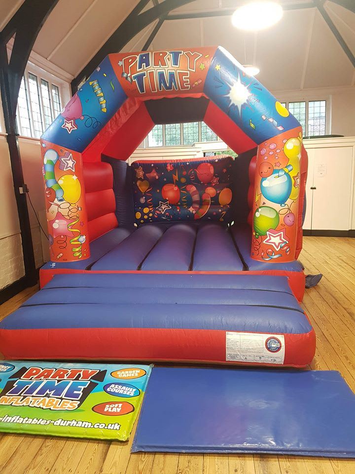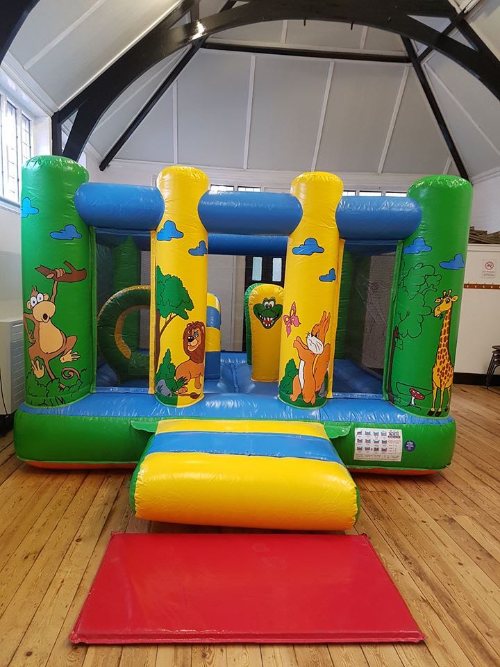 Any of our bouncy castles up to 13ft high and 15ft wide will fit in this venue as it is fairly narrow but has a high ceiling. Here's a photo of our Jungle Toddler Bouncy Castle and Party Time Bouncy Castle which have previously been hired in this hall.