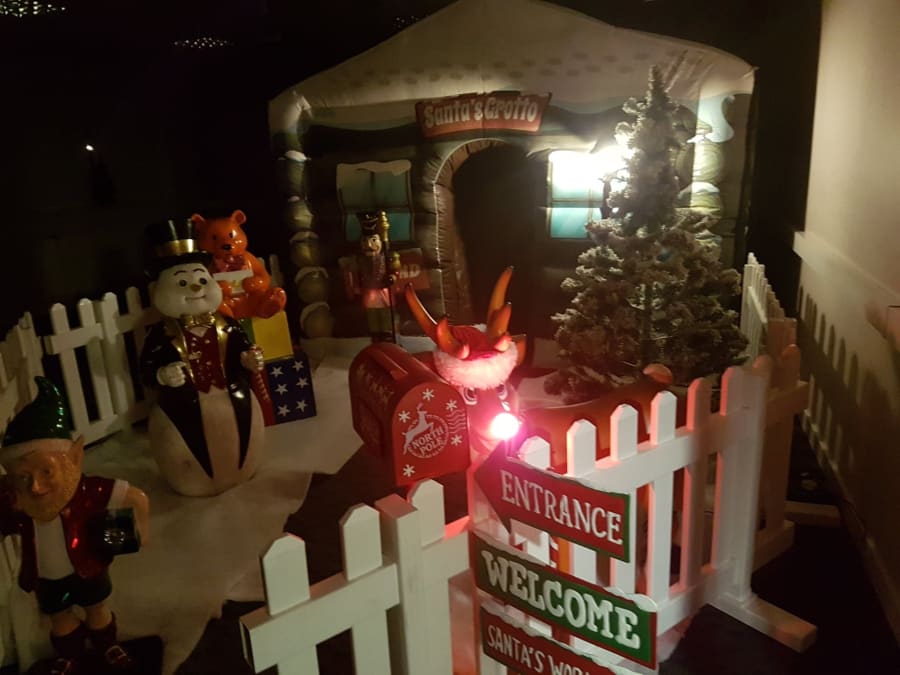 This Christmas Grotto package consists of Santas Christmas grotto which has fantastic artwork inside and outside. Santa's grotto is a log cabin effect with a snowy roof and inside has a cosy fireplace scene. Inside the grotto there is a rocking chair for Santa to sit in and an artificial Christmas tree with fairy lights.